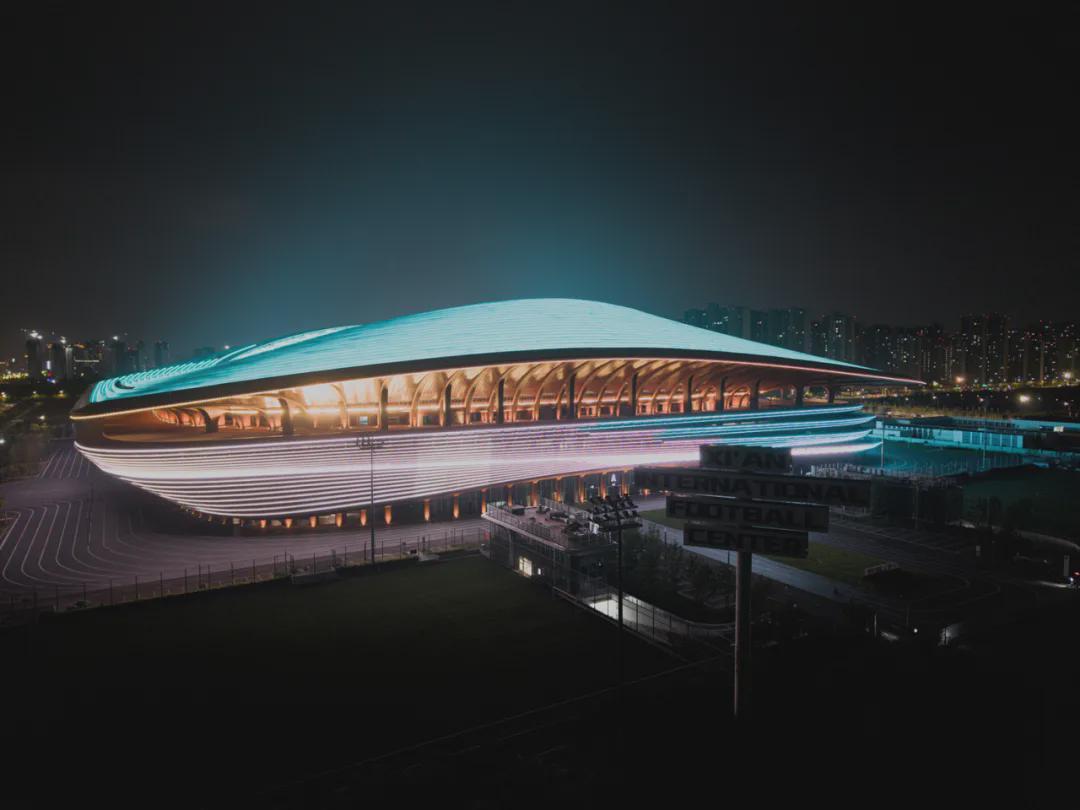 西安国际足球中心:位于西咸新区沣东新城轴线核心区,占地规模280亩,建筑面积26.8万平方米(含配套运营3.2万平方米),涵盖6万余个固定座席的主场馆、4个国际标准训练场,可承接包括世界杯在内的国际一流足球赛事。