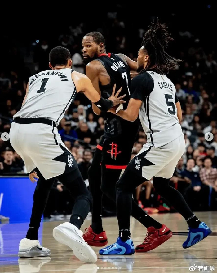 而且火箭防守端的问题尤为突出。球队在内线护框几乎为0,申京在篮下防守如同纸糊一般无力。面对文班亚马这样的超巨级内线,以及马刺高效的外线投射,全场命中21记三分,命中率高达53%,火箭的防守策略完全崩盘。马刺轻松拉开空间,多次打出流畅的传切配合,而火箭的协防和轮转迟缓,导致对手屡屡命中空位三分。杜兰特虽然努力在进攻端得分贡献23分,但防守端也难以完全覆盖马刺的进攻火力。